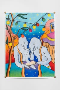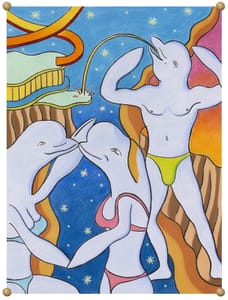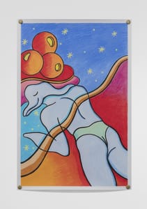 In Benny Blown Away, Matos transports his beluga beyond the murky riverbanks of London. reappears in sunlit, Mediterranean-inspired surroundings, a world of stylised leisure and warmth that echoes through much of Matos’s practice. The belugas depicted in the pastel drawings are no longer misplaced marine mammals, but charismatic, anthropomorphic characters at ease in their new climate. They smoke, chat, listen to music, inhabiting a world of leisurely rituals and soft hedonism, somewhere between daydream and performance. Originally displaced by the brutal realities of climate change, these animals are reimagined by the artist within the stylised ease of dolce far niente, in a gentle, ironic reflection on media- oriented society and ecological crisis. Their soft, languid outlines seem almost to melt into their surroundings, as if ease itself had a shape—figures of comfort whose seductive presence quietly exposes the contradictions of a world that turns crisis into spectacle.
