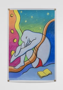 Executed in pastel the drawings will be framed—though not in the traditional sense. On-site at Frieze, Matos will extend the world of Benny Blown Away into a hand-drawn mural, where the belugas and their sprouts will theatrically frame the drawings. It’s an ironic framing device that both elevates and gently mocks the idea of ‘the frame’ itself.